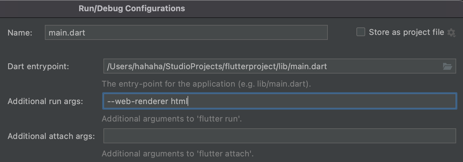 Additional run args 에 --web-render html 을 추가한 다음 apply 또는 OK 버튼을 누르면 된다.