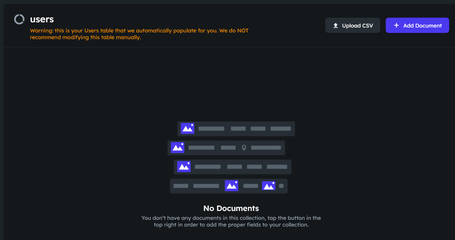 FlutterFlow에서 다시 Manage Content 버튼을 눌러보니 새창이 열리면서 이번에는 'No Documents'가 나온다